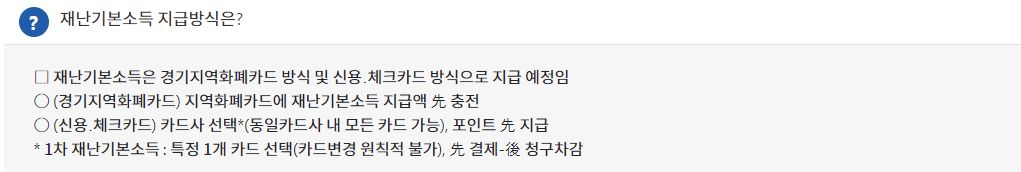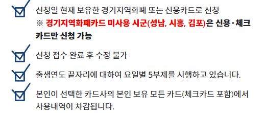 - 경기지역화폐카드 미사용 시군(성남, 시흥, 김포)은 신용/체크카드만 신청 가능합니다.