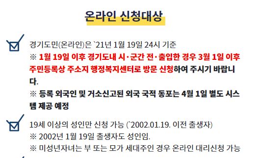 - 2021년 1월 19일 24시 기준으로 경기도민이어야 합니다. 그리고 신청할때까지 도민이어야 합니다.