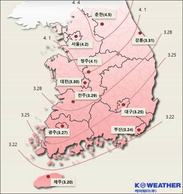 위의 자료는 케이웨더에서 제공하는 정보입니다. 날씨 정보 관련으로는 정확도가 높아 평소 다양한 정보를 이곳에서 살펴보는 편입니다. 평년 벚꽃 시즌 보다 빨리 필 것으로 예상됩니다. 개화 시기부터 만개까지 일 주일 정도 걸리니 고 사이에 잠시 구경 일정을 잡으면 되겠네요.