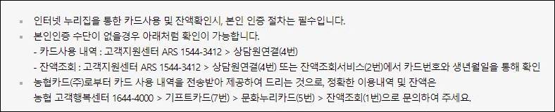 - 농협 고객행복센터 1644-4000 > 기프트카드(7번) > 문화누리카드 (5번) > 잔액조회 (1번)