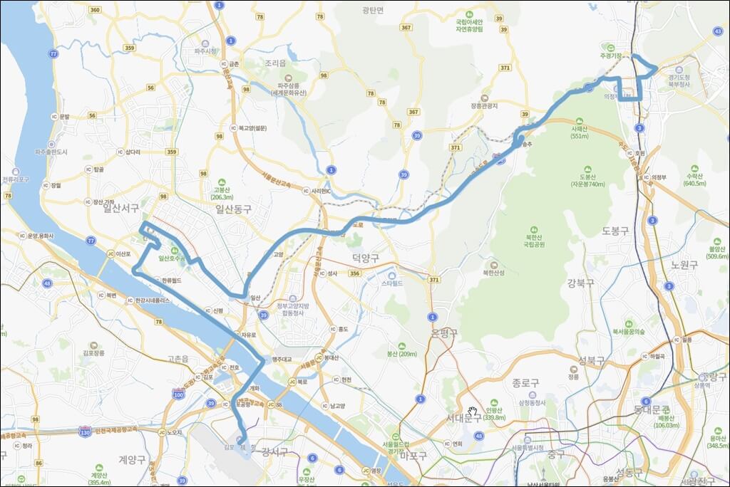 의정부 차고지 > 의정부 신도브래뉴 > 부대찌개거리 > 의정부역 > 의정부 3동 우체국 > 범골 입구 > 의정부 시청 > 흥선 부라운 스톤 > 송추 > 백석역 > 마두역 > 일산호수공원 > 일산노인복지회관 > 킨텍스 > 제2킨텍스 > 소노캄 호텔 > 김포공항