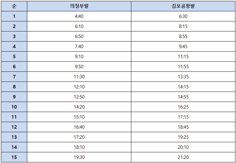 개인적으로 지하철이 가까운 분들은 5호선, 9호선을 활용하여 김포공항이나 인천국제공항까지 가는 게 좋다고 생각합니다. 일산이나 의정부 시민들이라면 위치상 굉장히 애매하기 때문에 7300 공항버스를 이용해야 합니다. 최신 시간표를 보고싶다면 아래 바로가기를 통해 살펴볼 수 있습니다.